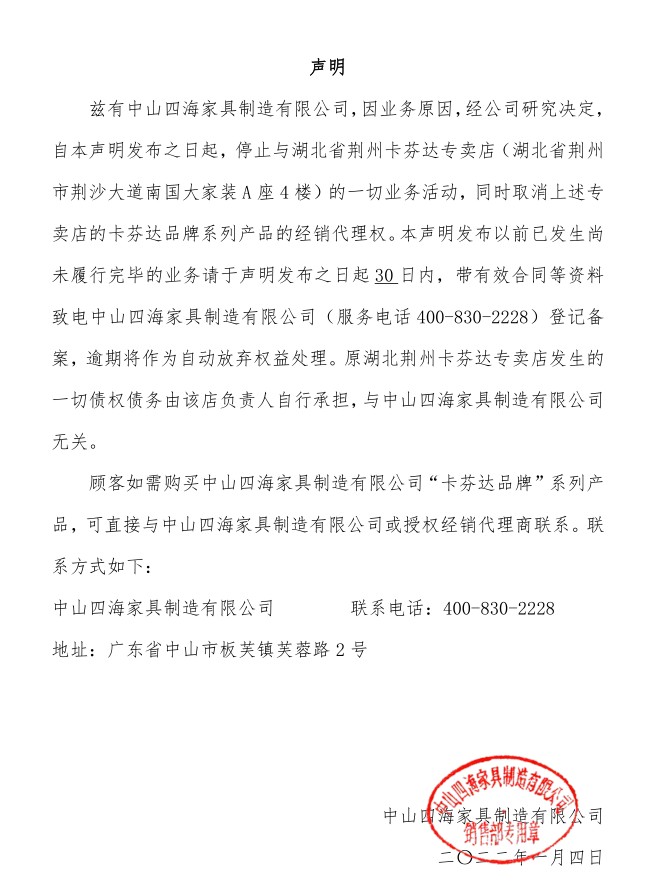 關(guān)于公司屬下品牌卡芬達(dá)家居及各子系列產(chǎn)品調(diào)價(jià)的通知